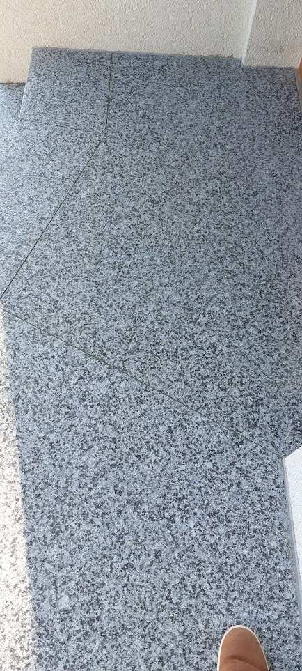 V tejto bratislavskej realizácii zohráva hlavnú úlohu granit Tarn – prírodný kameň s jemne svetlosivým podkladom a decentným tmavým zrnom, ktorý je obľúbenou voľbou pre exteriérové aplikácie vďaka svojej pevnosti a odolnosti.