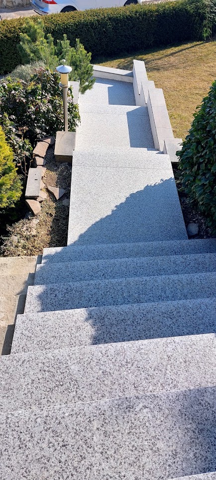 Realizácia zahŕňala kompletné obloženie schodiska od vstupnej brány až po vstupné dvere domu, čím vznikol plynulý a elegantný prechod do obytného priestoru. Kameň bol rezaný s dôrazom na čisté línie a precízne detaily, pričom bočné múriky boli zakončené širšími platňami, ktoré pôsobia nielen esteticky, ale zároveň prakticky chránia štruktúru pred poškodením.