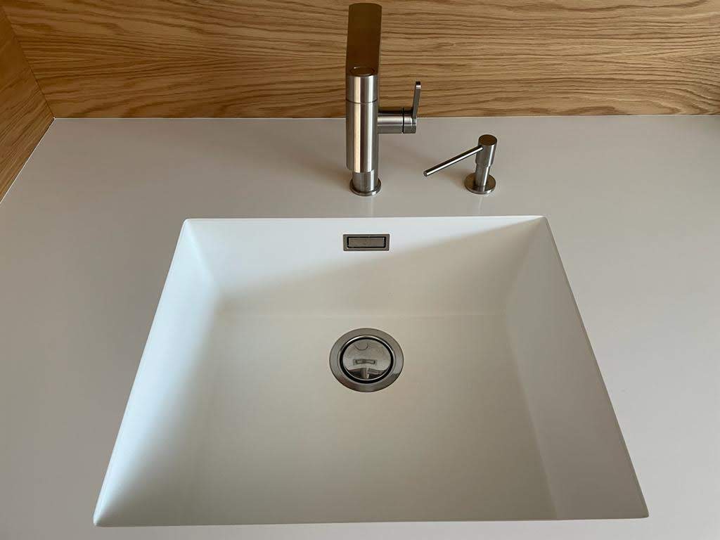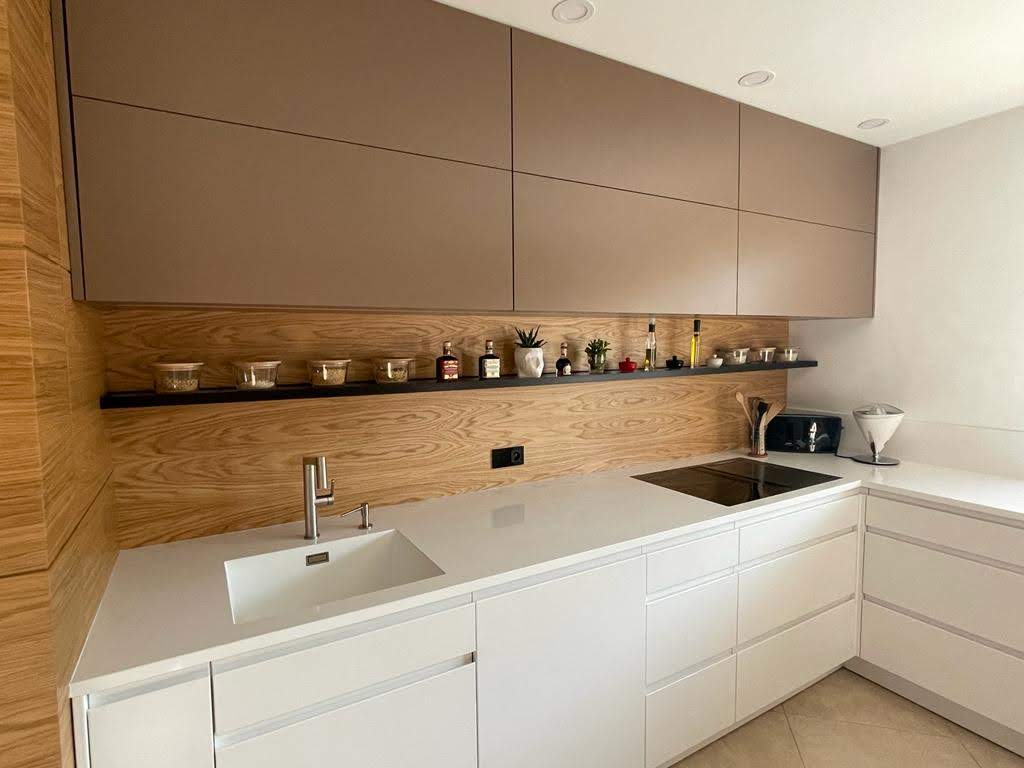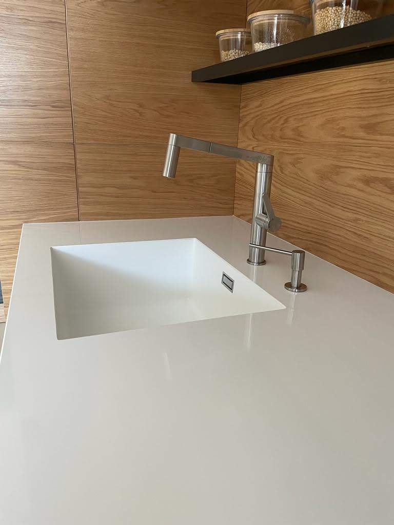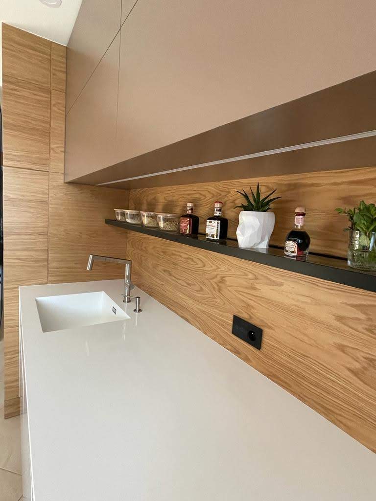 Pracovná doska plynule prechádza aj do integrovaného drezového priestoru, ktorý je zhotovený z rovnakého materiálu, čím vznikol dojem jednoliateho monolitu. Minimalistický dizajn kuchyne dopĺňa jemná kresba prírodného dreva na stenách a čisté línie matných skriniek bez úchytiek.