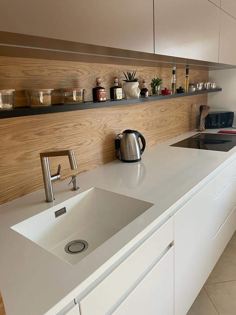 Do kuchyne sme si vybrali pracovnú dosku a ostrov z Technistone a bola to výborná voľba. Materiál je príjemný na dotyk, pôsobí pevne a kvalitne a hlavne sa veľmi ľahko čistí, čo v kuchyni naozaj oceníte. Aj po čase používania vyzerá stále ako nový. S výsledkom sme maximálne spokojní.
