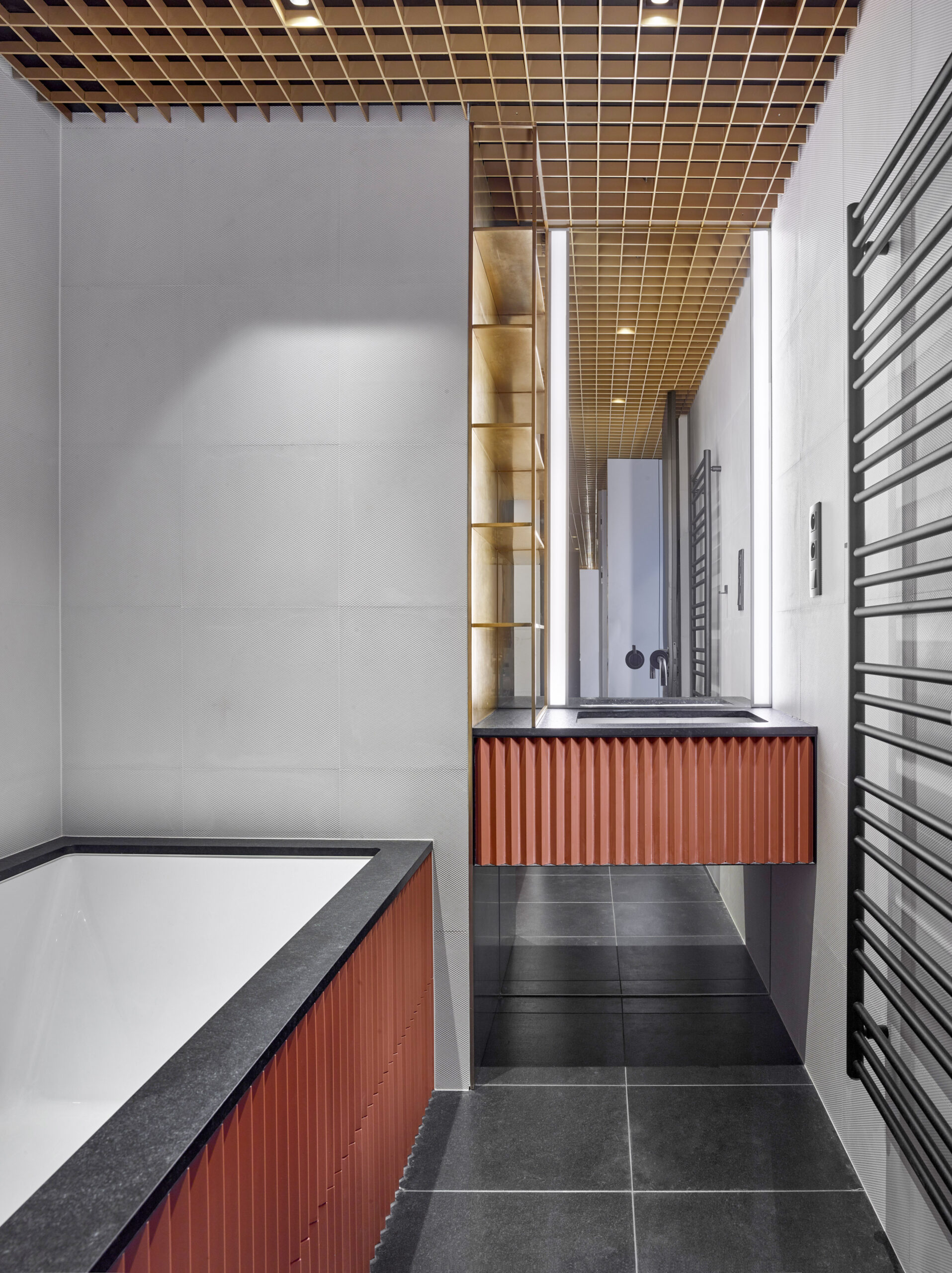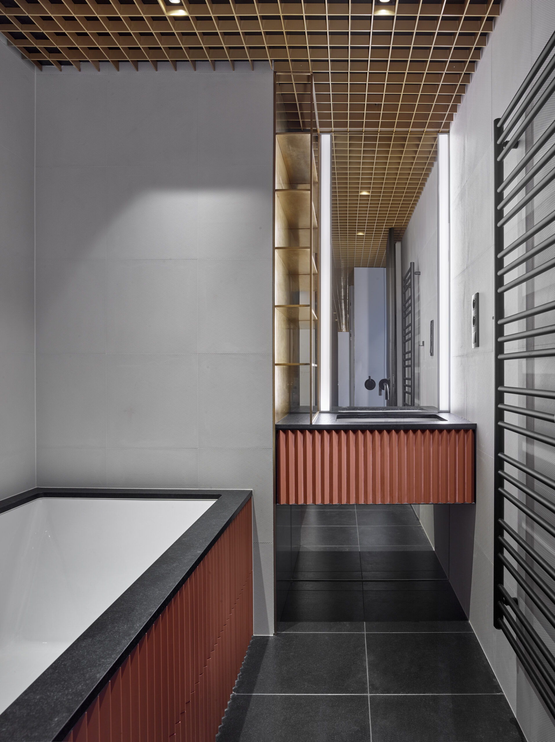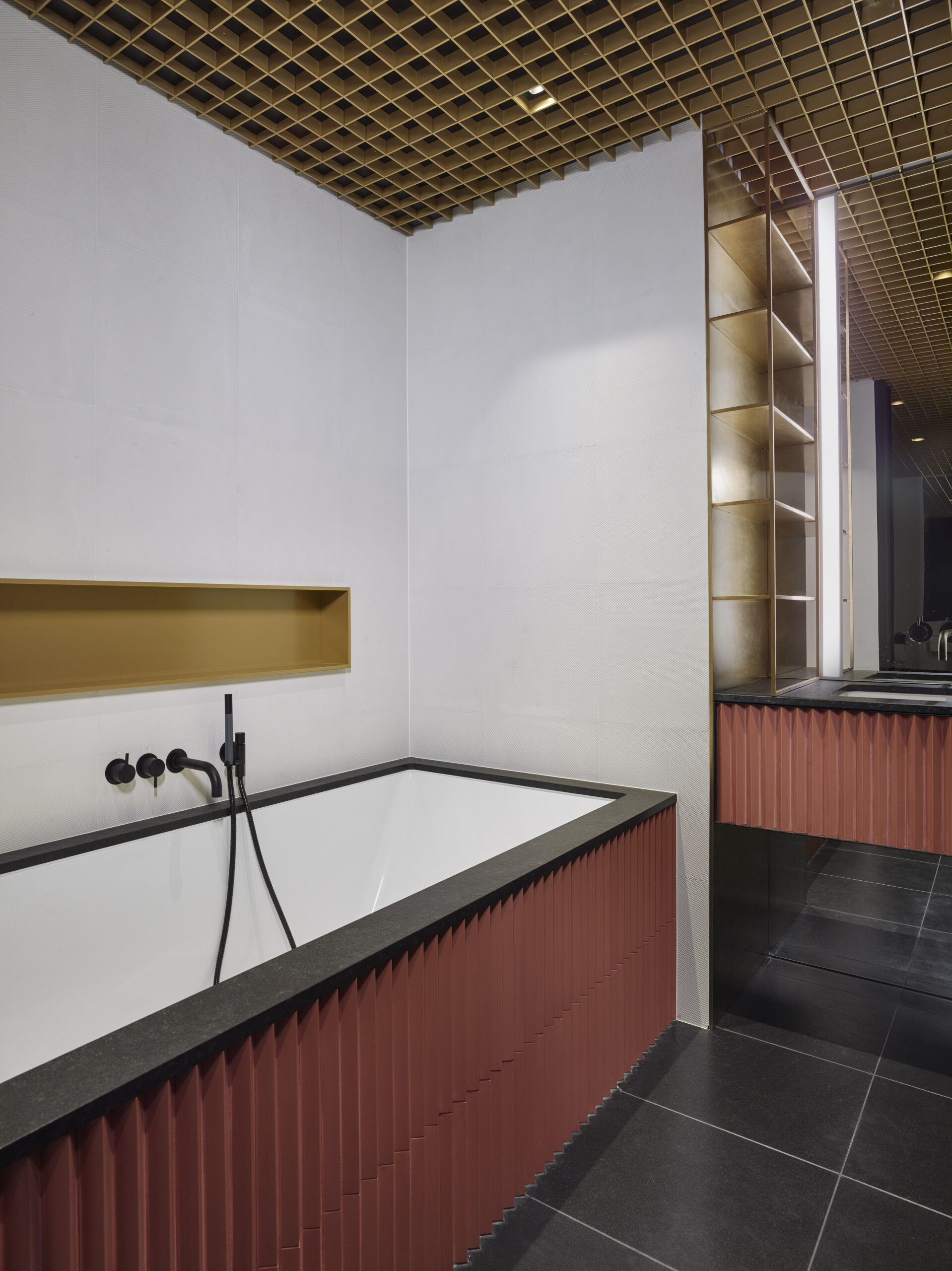Leštený čierny kameň bol použitý ako rámovanie vane a doska pod umývadlo, pričom jeho čisté línie a presné opracovanie podčiarkujú vysokú úroveň remeselného spracovania. Spojením s matnými čiernymi batériami a geometrickým stropným rasterom vznikol harmonický a zároveň odvážny koncept interiéru, ktorý pôsobí moderne, ale zároveň intímne.