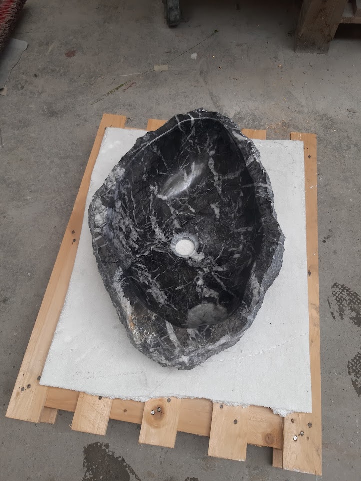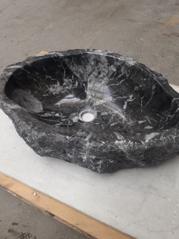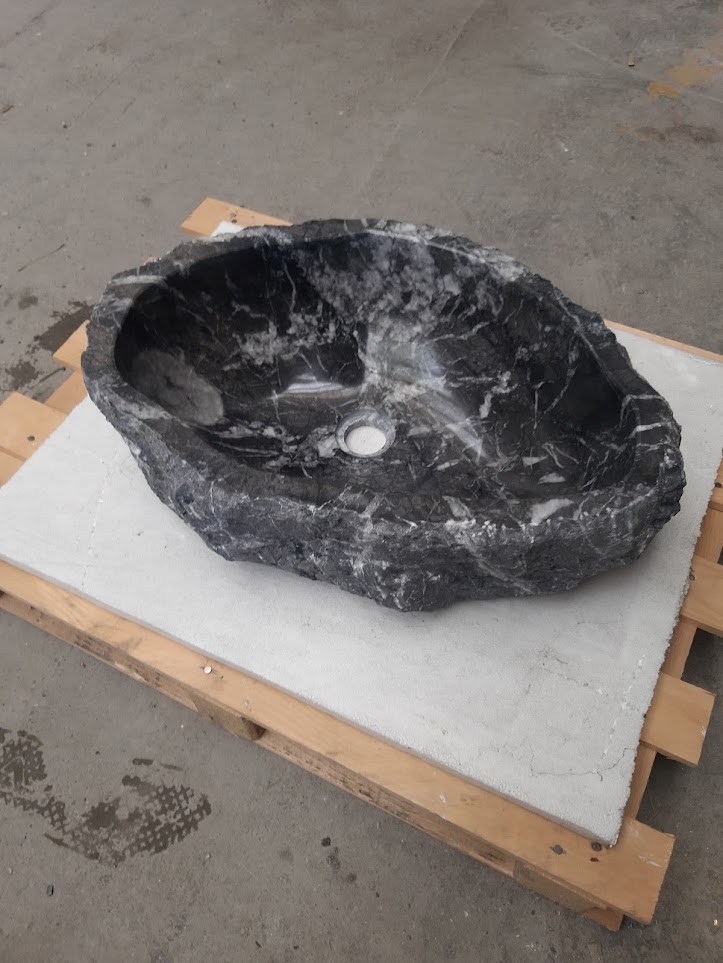 Grigio Carnico je tmavý mramor so sýto sivým až čiernym základom a dramatickou kresbou bielych žíl. V tejto realizácii bola zachovaná nepravidelná vonkajšia štruktúra kameňa, čím umývadlo získava surový, až sochársky charakter.